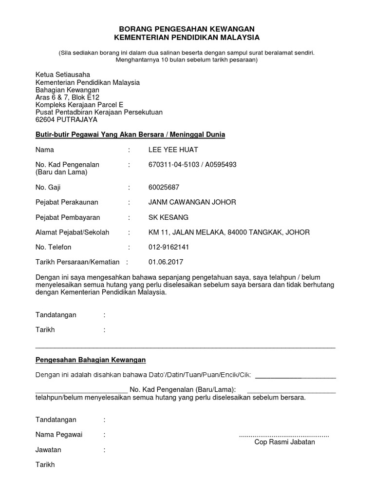 Borang Pengesahan Kewangan Kementerian Pendidikan Malaysia / Bahagian kewangan kementerian pelajaran malaysia putrajaya •.